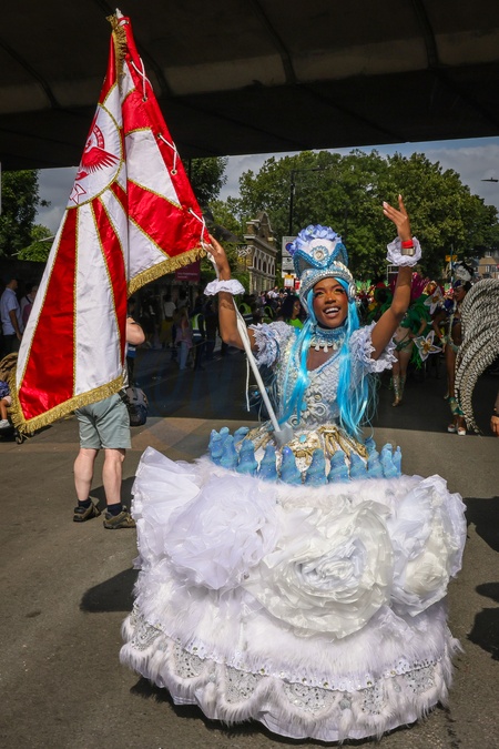 Notting Hill Carnival Monday procession and revellers, London, UK