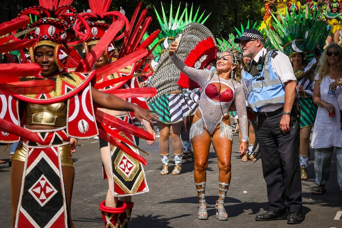 Notting Hill Carnival Monday procession and revellers, London, UK