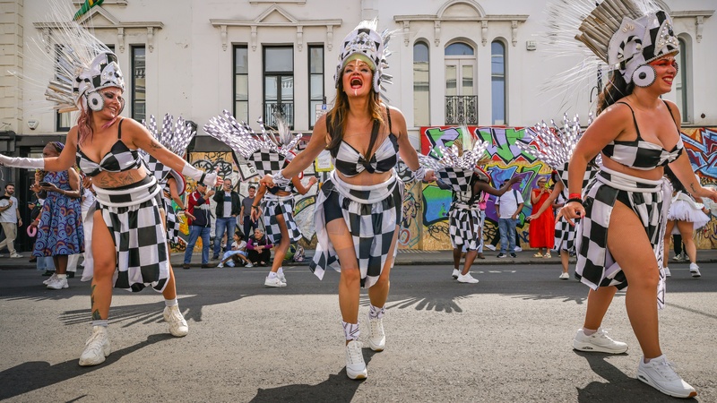 Notting Hill Carnival Monday procession and revellers, London, UK