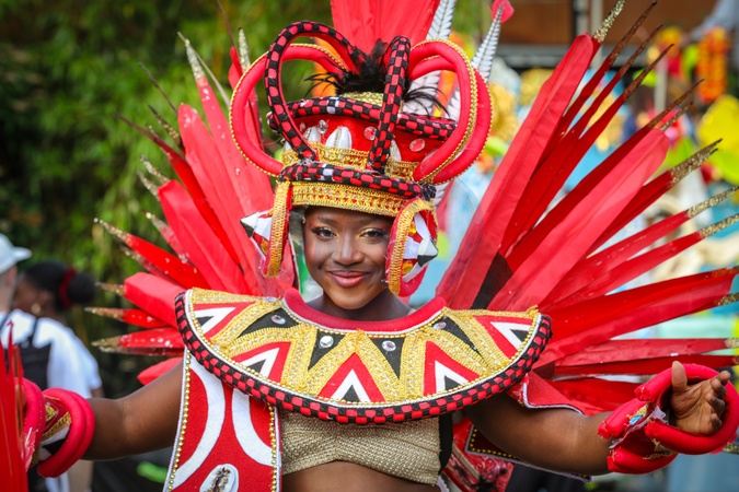Notting Hill Carnival Monday procession and revellers, London, UK