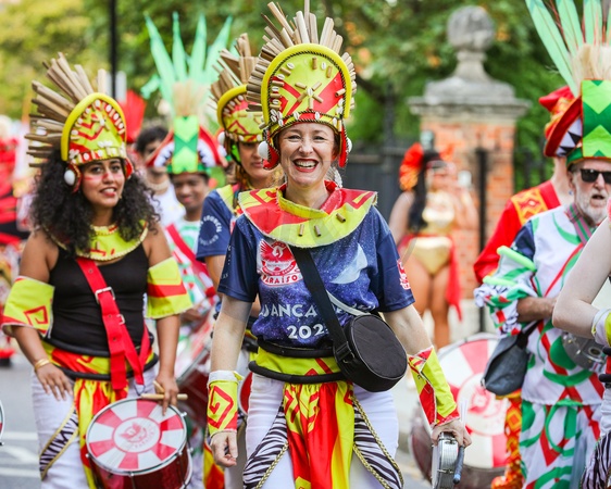 London,UK, 26th Aug 2024. Participants with the Paraiso School of Samba, one of the largest groups with nearly 200 performers and musicians, get from early morning until the start of the procession at noon. Notting Hill Carnival on Monday sees the main carnival procession of mas bands, drummers and Caribbean and South American Salsa, Samba and Soca groups. Revellers celebrate the Bank Holiday Weekend participating or watching along the carnival route, at sounds systems, stalls and venues on the second of two days of Notting Hill Carnival festivities., Credit:IMAGEPLOTTER / Avalon