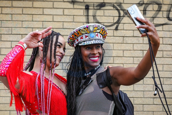 London,UK, 26th Aug 2024. Selfies are a must along the route. Notting Hill Carnival on Monday sees the main carnival procession of mas bands, drummers and Caribbean and South American Salsa, Samba and Soca groups. Revellers celebrate the Bank Holiday Weekend participating or watching along the carnival route, at sounds systems, stalls and venues on the second of two days of Notting Hill Carnival festivities., Credit:IMAGEPLOTTER / Avalon