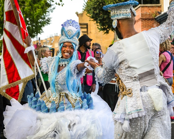 Notting Hill Carnival Monday procession and revellers, London, UK