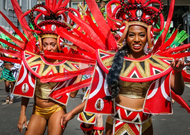 Notting Hill Carnival Monday procession and revellers, London, UK