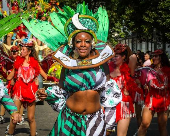 Notting Hill Carnival Monday procession and revellers, London, UK