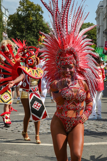 Notting Hill Carnival Monday procession and revellers, London, UK
