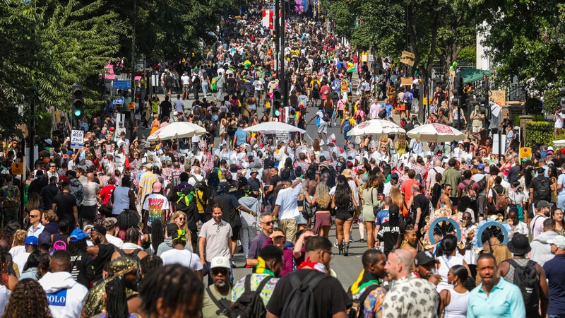 Poniedziałkowa procesja i biesiadnicy w Notting Hill Carnival, Londyn, Wielka Brytania