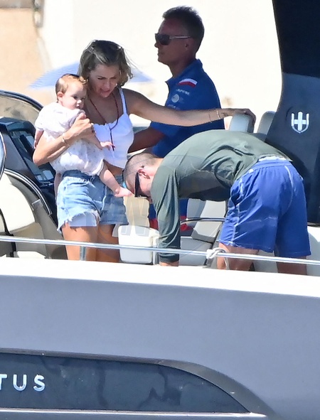 Exclusif - Prix Spécial - No Credit - BI - Sienna Miller et son compagnon Oli Green, avec leur fille de sept mois, sur un yacht à Saint-Tropez, le 22 août 2024. Déjà maman d'une fille de 11 ans, née de sa relation avec T.Sturridge, Sienna Miller a retrouvé les joies de la maternité, le 3 janvier dernier avec son cher et tendre, Oli Green. Merci de filouter le visage des enfants avant publication. Exclusive - Special Price - No Credit - BI - Sienna Miller and her partner Oli Green, with their seven-month-old daughter, on a yacht in Saint-Tropez, August 22, 2024. Already the mother of an 11-year-old daughter, born from her relationship with T. Sturridge, Sienna Miller rediscovered the joys of motherhood on January 3 with her dear and tender, Oli Green. Please pixelate children faces before publication.