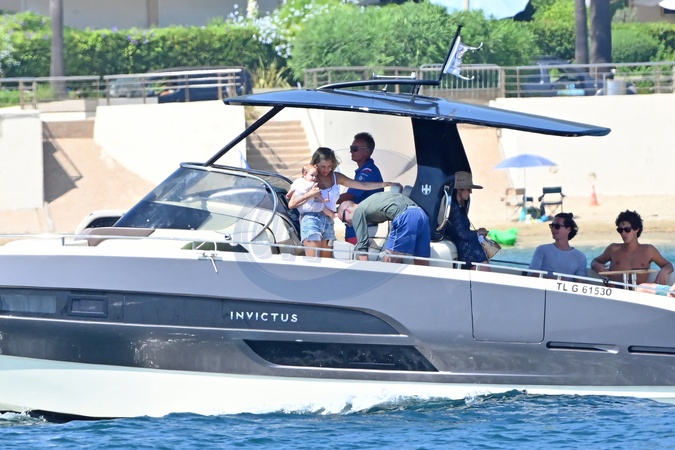 Exclusif - Prix Spécial - No Credit - BI - Sienna Miller et son compagnon Oli Green, avec leur fille de sept mois, sur un yacht à Saint-Tropez, le 22 août 2024. Déjà maman d'une fille de 11 ans, née de sa relation avec T.Sturridge, Sienna Miller a retrouvé les joies de la maternité, le 3 janvier dernier avec son cher et tendre, Oli Green. Merci de filouter le visage des enfants avant publication. Exclusive - Special Price - No Credit - BI - Sienna Miller and her partner Oli Green, with their seven-month-old daughter, on a yacht in Saint-Tropez, August 22, 2024. Already the mother of an 11-year-old daughter, born from her relationship with T. Sturridge, Sienna Miller rediscovered the joys of motherhood on January 3 with her dear and tender, Oli Green. Please pixelate children faces before publication.