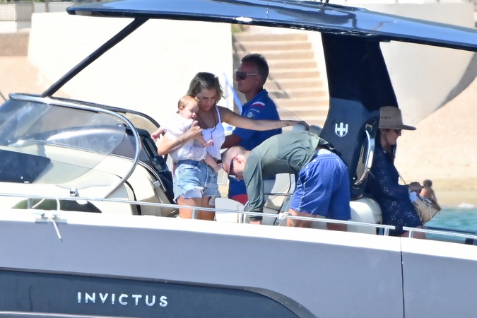 Exclusif - Prix Spécial - No Credit - BI - Sienna Miller et son compagnon Oli Green, avec leur fille de sept mois, sur un yacht à Saint-Tropez, le 22 août 2024. Déjà maman d'une fille de 11 ans, née de sa relation avec T.Sturridge, Sienna Miller a retrouvé les joies de la maternité, le 3 janvier dernier avec son cher et tendre, Oli Green. Merci de filouter le visage des enfants avant publication. Exclusive - Special Price - No Credit - BI - Sienna Miller and her partner Oli Green, with their seven-month-old daughter, on a yacht in Saint-Tropez, August 22, 2024. Already the mother of an 11-year-old daughter, born from her relationship with T. Sturridge, Sienna Miller rediscovered the joys of motherhood on January 3 with her dear and tender, Oli Green. Please pixelate children faces before publication.