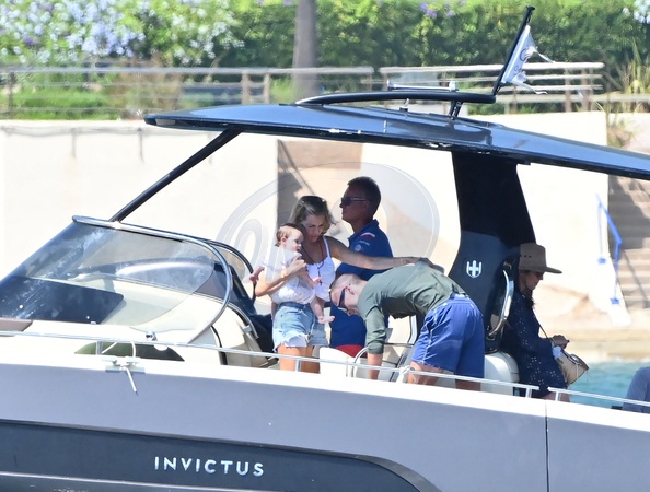 Exclusif - Prix Spécial - No Credit - BI - Sienna Miller et son compagnon Oli Green, avec leur fille de sept mois, sur un yacht à Saint-Tropez, le 22 août 2024. Déjà maman d'une fille de 11 ans, née de sa relation avec T.Sturridge, Sienna Miller a retrouvé les joies de la maternité, le 3 janvier dernier avec son cher et tendre, Oli Green. Merci de filouter le visage des enfants avant publication. Exclusive - Special Price - No Credit - BI - Sienna Miller and her partner Oli Green, with their seven-month-old daughter, on a yacht in Saint-Tropez, August 22, 2024. Already the mother of an 11-year-old daughter, born from her relationship with T. Sturridge, Sienna Miller rediscovered the joys of motherhood on January 3 with her dear and tender, Oli Green. Please pixelate children faces before publication.