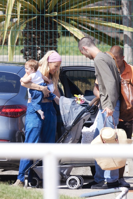 Exclusif - Prix Spécial - No Credit - BI - Sienna Miller, son compagnon Oli Green et leur fille de sept mois prennent un vol à l'aéroport de Nice, le 24 août 2024. Déjà maman d'une fille de 11 ans, née de sa relation avec T.Sturridge, Sienna Miller a retrouvé les joies de la maternité, le 3 janvier dernier avec son cher et tendre, Oli Green. Merci de filouter le visage des enfants avant publication Exclusive - Special Price - No Credit - BI - Sienna Miller, her partner Oli Green and their seven-month-old daughter take a flight at Nice airport on August 24, 2024. Already the mother of an 11-year-old daughter, born from her relationship with T. Sturridge, Sienna Miller rediscovered the joys of motherhood on January 3 with her dear and tender, Oli Green. Please pixelate children faces before publication.