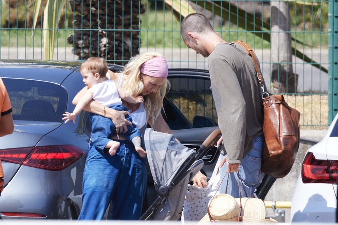 Exclusif - Prix Spécial - No Credit - BI - Sienna Miller, son compagnon Oli Green et leur fille de sept mois prennent un vol à l'aéroport de Nice, le 24 août 2024. Déjà maman d'une fille de 11 ans, née de sa relation avec T.Sturridge, Sienna Miller a retrouvé les joies de la maternité, le 3 janvier dernier avec son cher et tendre, Oli Green. Merci de filouter le visage des enfants avant publication Exclusive - Special Price - No Credit - BI - Sienna Miller, her partner Oli Green and their seven-month-old daughter take a flight at Nice airport on August 24, 2024. Already the mother of an 11-year-old daughter, born from her relationship with T. Sturridge, Sienna Miller rediscovered the joys of motherhood on January 3 with her dear and tender, Oli Green. Please pixelate children faces before publication.