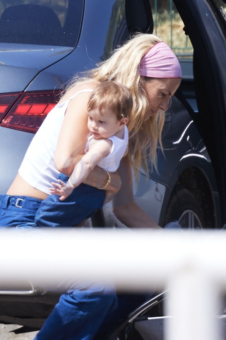 Exclusif - Prix Spécial - No Credit - BI - Sienna Miller, son compagnon Oli Green et leur fille de sept mois prennent un vol à l'aéroport de Nice, le 24 août 2024. Déjà maman d'une fille de 11 ans, née de sa relation avec T.Sturridge, Sienna Miller a retrouvé les joies de la maternité, le 3 janvier dernier avec son cher et tendre, Oli Green. Merci de filouter le visage des enfants avant publication Exclusive - Special Price - No Credit - BI - Sienna Miller, her partner Oli Green and their seven-month-old daughter take a flight at Nice airport on August 24, 2024. Already the mother of an 11-year-old daughter, born from her relationship with T. Sturridge, Sienna Miller rediscovered the joys of motherhood on January 3 with her dear and tender, Oli Green. Please pixelate children faces before publication.