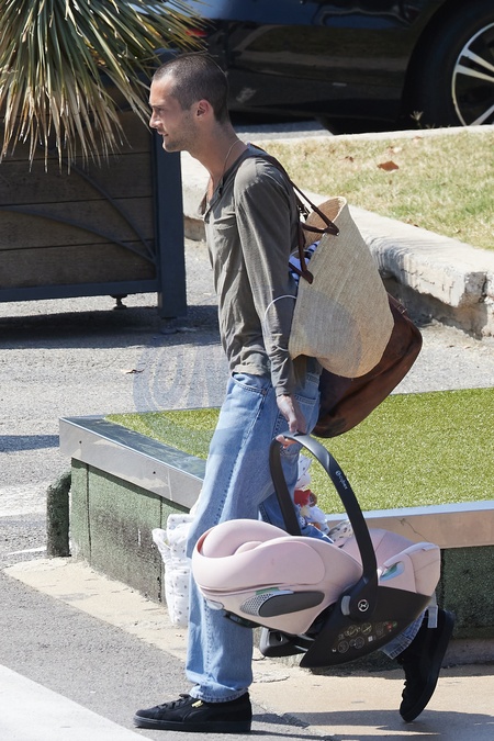 Exclusif - Prix Spécial - No Credit - BI - Sienna Miller, son compagnon Oli Green et leur fille de sept mois prennent un vol à l'aéroport de Nice, le 24 août 2024. Déjà maman d'une fille de 11 ans, née de sa relation avec T.Sturridge, Sienna Miller a retrouvé les joies de la maternité, le 3 janvier dernier avec son cher et tendre, Oli Green. Merci de filouter le visage des enfants avant publication Exclusive - Special Price - No Credit - BI - Sienna Miller, her partner Oli Green and their seven-month-old daughter take a flight at Nice airport on August 24, 2024. Already the mother of an 11-year-old daughter, born from her relationship with T. Sturridge, Sienna Miller rediscovered the joys of motherhood on January 3 with her dear and tender, Oli Green. Please pixelate children faces before publication.