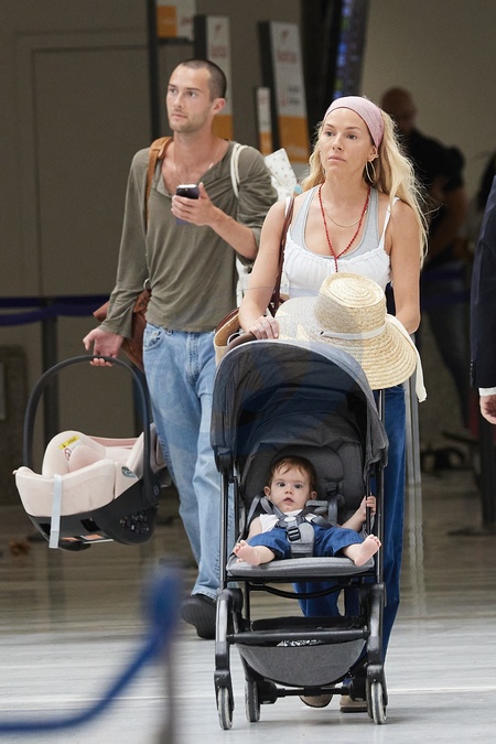 Exclusif - Prix Spécial - No Credit - BI - Sienna Miller, son compagnon Oli Green et leur fille de sept mois prennent un vol à l'aéroport de Nice, le 24 août 2024. Déjà maman d'une fille de 11 ans, née de sa relation avec T.Sturridge, Sienna Miller a retrouvé les joies de la maternité, le 3 janvier dernier avec son cher et tendre, Oli Green. Merci de filouter le visage des enfants avant publication Exclusive - Special Price - No Credit - BI - Sienna Miller, her partner Oli Green and their seven-month-old daughter take a flight at Nice airport on August 24, 2024. Already the mother of an 11-year-old daughter, born from her relationship with T. Sturridge, Sienna Miller rediscovered the joys of motherhood on January 3 with her dear and tender, Oli Green. Please pixelate children faces before publication.