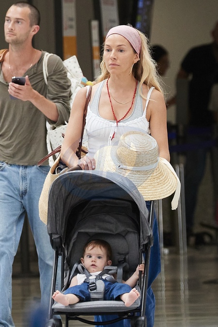 Exclusif - Prix Spécial - No Credit - BI - Sienna Miller, son compagnon Oli Green et leur fille de sept mois prennent un vol à l'aéroport de Nice, le 24 août 2024. Déjà maman d'une fille de 11 ans, née de sa relation avec T.Sturridge, Sienna Miller a retrouvé les joies de la maternité, le 3 janvier dernier avec son cher et tendre, Oli Green. Merci de filouter le visage des enfants avant publication Exclusive - Special Price - No Credit - BI - Sienna Miller, her partner Oli Green and their seven-month-old daughter take a flight at Nice airport on August 24, 2024. Already the mother of an 11-year-old daughter, born from her relationship with T. Sturridge, Sienna Miller rediscovered the joys of motherhood on January 3 with her dear and tender, Oli Green. Please pixelate children faces before publication.