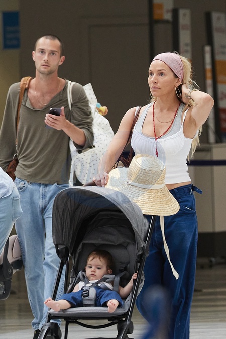 Exclusif - Prix Spécial - No Credit - BI - Sienna Miller, son compagnon Oli Green et leur fille de sept mois prennent un vol à l'aéroport de Nice, le 24 août 2024. Déjà maman d'une fille de 11 ans, née de sa relation avec T.Sturridge, Sienna Miller a retrouvé les joies de la maternité, le 3 janvier dernier avec son cher et tendre, Oli Green. Merci de filouter le visage des enfants avant publication Exclusive - Special Price - No Credit - BI - Sienna Miller, her partner Oli Green and their seven-month-old daughter take a flight at Nice airport on August 24, 2024. Already the mother of an 11-year-old daughter, born from her relationship with T. Sturridge, Sienna Miller rediscovered the joys of motherhood on January 3 with her dear and tender, Oli Green. Please pixelate children faces before publication.
