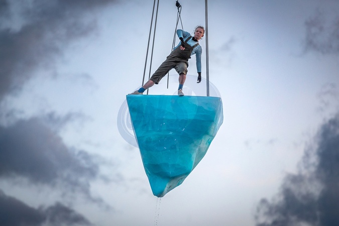 University of East London Docklands campus, UK. Saturday 24th and Sunday 25th August.Thaw is the a performance by Australian theatre company Legs on the wallPerformersperformed for 8 hours on a 2.7 tonne melting ice sculpture which was hoisted at times 20 meters in the air to a score by the Alaskan composer Matthew Burtner.Thaw addresses humankind's impact on the planet. The performance was part of the Greenwich and Docklands International Festival (GDIF) which is on from 23 August - 8th September., Credit:Abdullah Bailey / Avalon