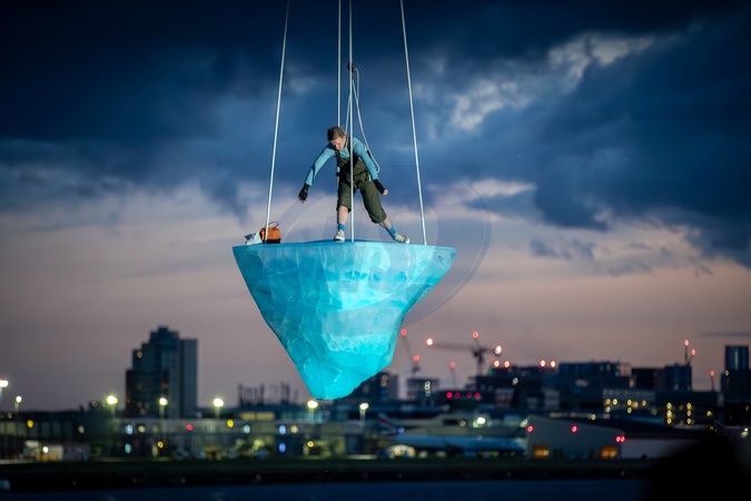 University of East London Docklands campus, UK. Saturday 24th and Sunday 25th August.Thaw is the a performance by Australian theatre company Legs on the wallPerformersperformed for 8 hours on a 2.7 tonne melting ice sculpture which was hoisted at times 20 meters in the air to a score by the Alaskan composer Matthew Burtner.Thaw addresses humankind's impact on the planet. The performance was part of the Greenwich and Docklands International Festival (GDIF) which is on from 23 August - 8th September., Credit:Abdullah Bailey / Avalon