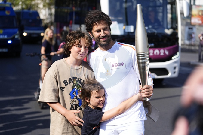 Benjamin Millepied lors du relais de la Flamme Paralympique pour Paris2024, Paris, France. © Gervot / Panoramic / Bestimage B.Millepied and J.Chan carry the Paralympic Games flame in Paris, a few hours before the opening ceremony, August 28th, 2024.