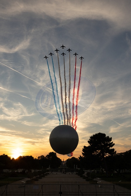 La patrouille de France survolant la vasque olympique lors de la cérémonie d'ouverture des Jeux Paralympiques de Paris 2024