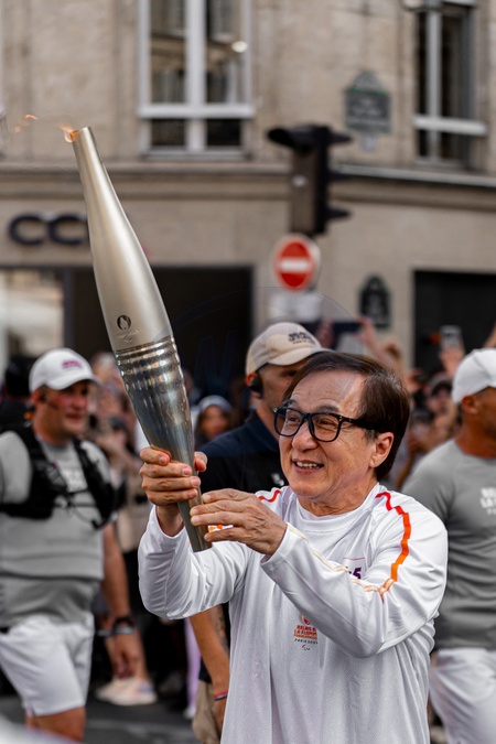 Jackie Chan porte la flamme des Jeux Paralympiques de Paris 2024, quelques heures avant la cérémonie d'ouverture le 28 août 2024. © Guillaume Boisserie / Bestimage Jackie Chan carries the flame for the Paris 2024 Paralympic Games, a few hours before the opening ceremony on August 28, 2024.
