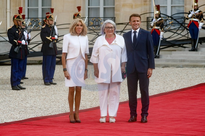 Brigitte Macron, Mary Simon (gouverneure générale du Canada), Emmanuel Macron - Réception des chefs d'état, de gouvernement et d'organisation internationale en amont de la cérémonie d'ouverture des jeux paralympiques de Paris 2024 au palais de l'Elysée à Paris, France, le 28 août 2024. © Christophe Clovis / Bestimage President E.Macron and his wife B.Macron welcome heads of state, government and international organisations ahead of the opening ceremony of the Paris 2024 Paralympic Games at the Elysée Palace in Paris on august 28th 2024