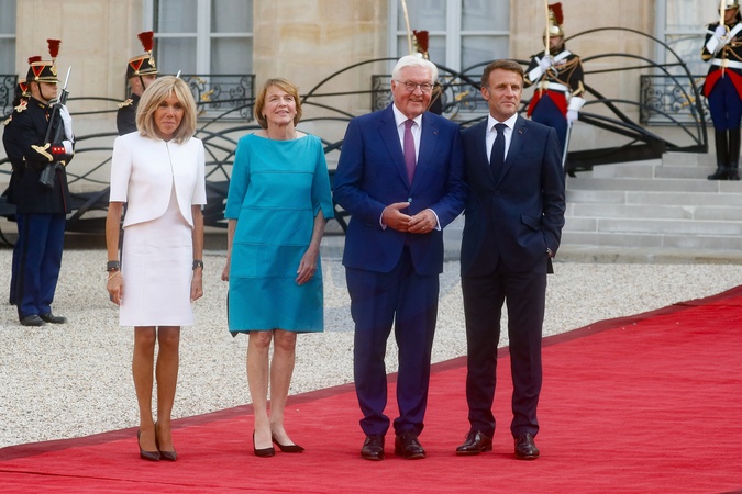 Brigitte Macron, Frank-Walter Steinmeier (président de la république fédérale d'Allemagne) et sa femme Elke Büdenbende, Emmanuel Macron - Réception des chefs d'état, de gouvernement et d'organisation internationale en amont de la cérémonie d'ouverture des jeux paralympiques de Paris 2024 au palais de l'Elysée à Paris, France, le 28 août 2024. © Christophe Clovis / Bestimage President E.Macron and his wife B.Macron welcome heads of state, government and international organisations ahead of the opening ceremony of the Paris 2024 Paralympic Games at the Elysée Palace in Paris on august 28th 2024
