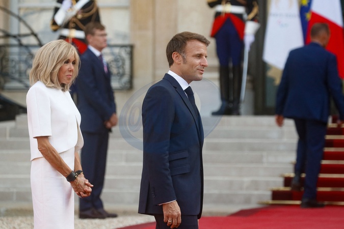 Prezydent Emmanuel Macron i jego żona Brigitte Macron witają głowy państw, rządów i organizacji międzynarodowych przed ceremonią otwarcia Igrzysk Paraolimpijskich Paryż 2024 w Pałacu Elizejskim w Paryżu