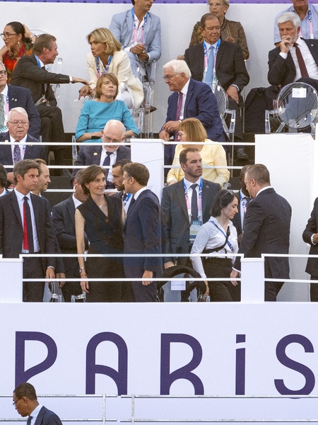 Gabriel Attal, premier ministre, Amélie Oudéa-Castera, ministre des sports, le président Emmanuel Macron lors de la cérémonie d'ouverture des jeux paralympiques Paris 2024 place de la Concorde à Paris le 28 août 2024. © Perusseau / Jacovides / Bestimage Opening ceremony of the Paris 2024 Paralympic Games at Place de la Concorde in Paris on 28 August 2024.
