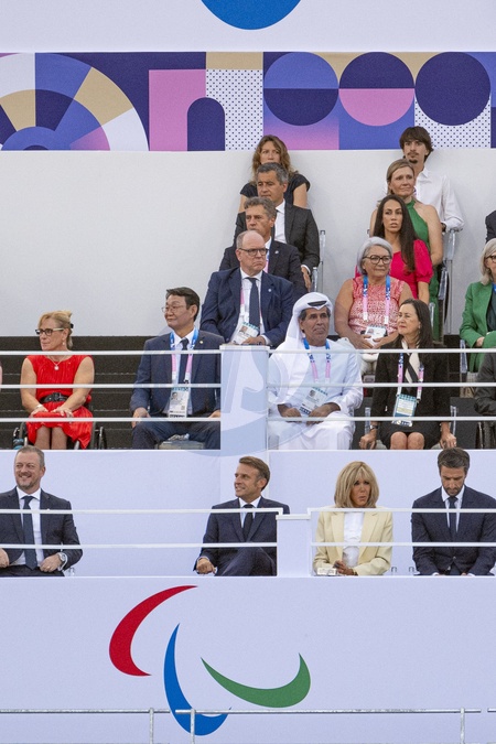 Le prince Albert II de Monaco, Andrew Parsons, président du comité international paralympique, le président Emmanuel Macron, Brigitte Macron, Tony Estanguet lors de la cérémonie d'ouverture des jeux paralympiques Paris 2024 place de la Concorde à Paris le 28 août 2024. © Perusseau / Jacovides / Bestimage Opening ceremony of the Paris 2024 Paralympic Games at Place de la Concorde in Paris on 28 August 2024.