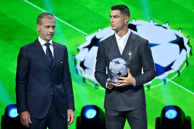 Cristiano Ronaldo reçoit le prix de meilleur buteur de tous les temps lors du tirage au sort UEFA pour la saison 2024/2025 au forum Grimaldi à Monaco