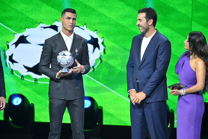 Cristiano Ronaldo reçoit le prix de meilleur buteur de tous les temps lors du tirage au sort UEFA pour la saison 2024/2025 au forum Grimaldi à Monaco