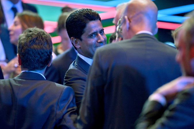 Nasser al-Khelaïfi, le président du PSG, durant le tirage au sort des rencontres de la phase régulière de la Ligue des champions pour la saison 2024-2025 et remises du prix du meilleur buteur de tous les temps de l'UEFA Champions League à Cristiano Ronaldo et du Prix du président de l'UEFA 2024 à Gianluigi Buffon, au Grimaldi Forum à Monaco, le 29 août 2024. © Bruno Bebert / Bestimage C.Ronaldo receives the award for all-time top scorer at the UEFA draw for the 2024/2025 season at the Grimaldi Forum in Monaco on august 29th 2024