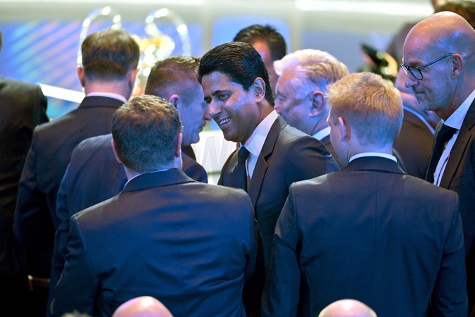 Nasser al-Khelaïfi, le président du PSG, durant le tirage au sort des rencontres de la phase régulière de la Ligue des champions pour la saison 2024-2025 et remises du prix du meilleur buteur de tous les temps de l'UEFA Champions League à Cristiano Ronaldo et du Prix du président de l'UEFA 2024 à Gianluigi Buffon, au Grimaldi Forum à Monaco, le 29 août 2024. © Bruno Bebert / Bestimage C.Ronaldo receives the award for all-time top scorer at the UEFA draw for the 2024/2025 season at the Grimaldi Forum in Monaco on august 29th 2024