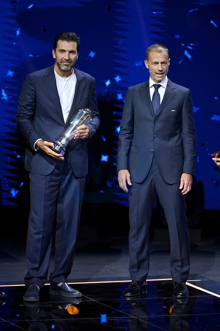 Gianluigi Buffon et Aleksander Ceferin, le président de l'UEFA, durant le tirage au sort des rencontres de la phase régulière de la Ligue des champions pour la saison 2024-2025 et remises du prix du meilleur buteur de tous les temps de l'UEFA Champions League à Cristiano Ronaldo et du Prix du président de l'UEFA 2024 à Gianluigi Buffon, au Grimaldi Forum à Monaco, le 29 août 2024. © Bruno Bebert / Bestimage C.Ronaldo receives the award for all-time top scorer at the UEFA draw for the 2024/2025 season at the Grimaldi Forum in Monaco on august 29th 2024