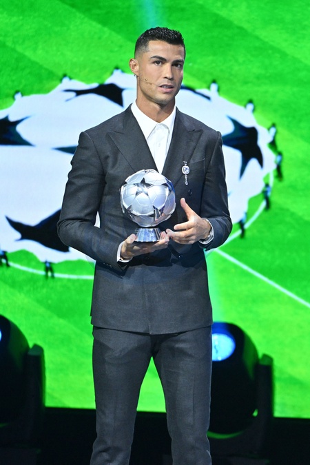 Cristiano Ronaldo durant le tirage au sort des rencontres de la phase régulière de la Ligue des champions pour la saison 2024-2025 et remises du prix du meilleur buteur de tous les temps de l'UEFA Champions League à Cristiano Ronaldo et du Prix du président de l'UEFA 2024 à Gianluigi Buffon, au Grimaldi Forum à Monaco, le 29 août 2024. © Bruno Bebert / Bestimage C.Ronaldo receives the award for all-time top scorer at the UEFA draw for the 2024/2025 season at the Grimaldi Forum in Monaco on august 29th 2024