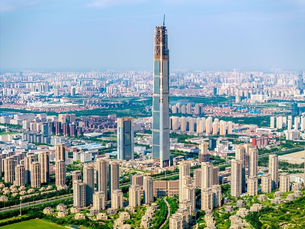 A view of the unfinished 597-meter-tall Goldin Finance 117 Tower in north China's Tianjin Municipality Wednesday, Aug. 28, 2024. The supertall made to the world's fifth place when it was topped out in 2015, but poor sales has failed its completion., Credit:FEATURECHINA / Avalon