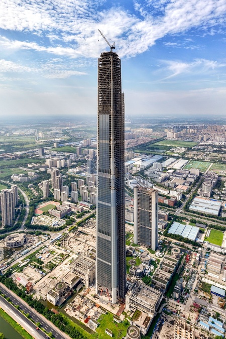 A view of the unfinished 597-meter-tall Goldin Finance 117 Tower in north China's Tianjin Municipality Wednesday, Aug. 28, 2024. The supertall made to the world's fifth place when it was topped out in 2015, but poor sales has failed its completion., Credit:FEATURECHINA / Avalon