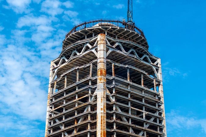 A view of the unfinished 597-meter-tall Goldin Finance 117 Tower in north China's Tianjin Municipality Wednesday, Aug. 28, 2024. The supertall made to the world's fifth place when it was topped out in 2015, but poor sales has failed its completion., Credit:FEATURECHINA / Avalon