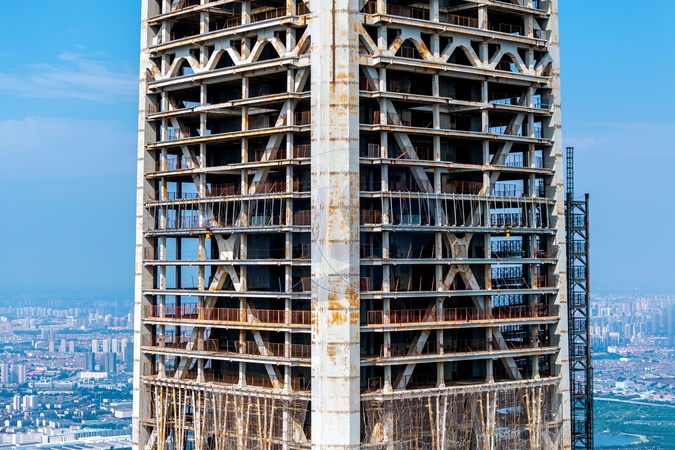 A view of the unfinished 597-meter-tall Goldin Finance 117 Tower in north China's Tianjin Municipality Wednesday, Aug. 28, 2024. The supertall made to the world's fifth place when it was topped out in 2015, but poor sales has failed its completion., Credit:FEATURECHINA / Avalon