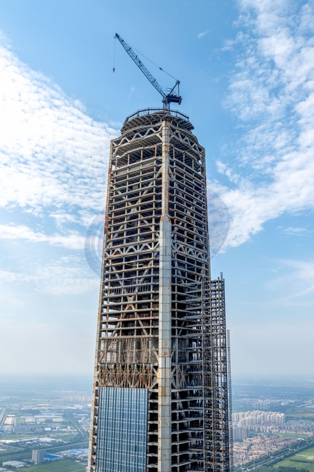 A view of the unfinished 597-meter-tall Goldin Finance 117 Tower in north China's Tianjin Municipality Wednesday, Aug. 28, 2024. The supertall made to the world's fifth place when it was topped out in 2015, but poor sales has failed its completion., Credit:FEATURECHINA / Avalon