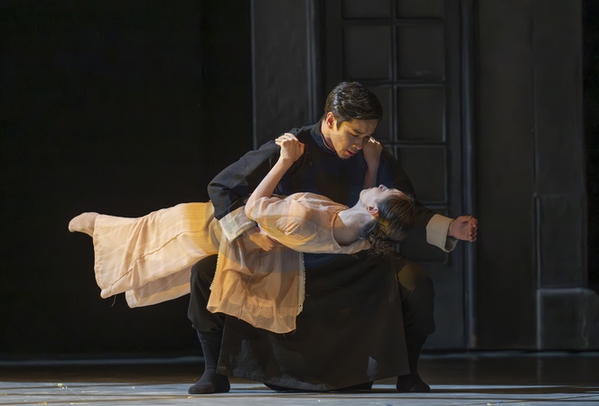 Sadlers Wells, London, UK. 29th August, 2024. Wing Chun - A fusion of contemporary dance, drama and martial arts tells the true story of Grandmaster Yip Man, trainer of Bruce Lee, choreographed by Han Zhen and Zhou Liya & written by Feng Shuangbai. Running from 30 Aug-7 Sept the spectacle tells the story of the 300-year-old martial art Wing Chun and the man who is credited with bringing it to the world, Grandmaster Yip Man, the man who trained Bruce Lee and founded The Ving Tsun Athletic Association. Image: Main character and his wife: Yip Man played by Chang Hongji, Yongcheng played by Xu Tianhui., Credit:MALCOLM PARK / Avalon