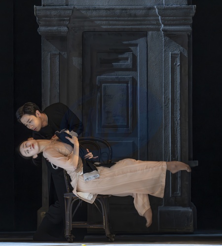Sadlers Wells, London, UK. 29th August, 2024. Wing Chun - A fusion of contemporary dance, drama and martial arts tells the true story of Grandmaster Yip Man, trainer of Bruce Lee, choreographed by Han Zhen and Zhou Liya & written by Feng Shuangbai. Running from 30 Aug-7 Sept the spectacle tells the story of the 300-year-old martial art Wing Chun and the man who is credited with bringing it to the world, Grandmaster Yip Man, the man who trained Bruce Lee and founded The Ving Tsun Athletic Association. Image: Main character and his wife: Yip Man played by Chang Hongji, Yongcheng played by Xu Tianhui., Credit:MALCOLM PARK / Avalon