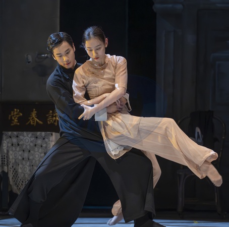 Sadlers Wells, London, UK. 29th August, 2024. Wing Chun - A fusion of contemporary dance, drama and martial arts tells the true story of Grandmaster Yip Man, trainer of Bruce Lee, choreographed by Han Zhen and Zhou Liya & written by Feng Shuangbai. Running from 30 Aug-7 Sept the spectacle tells the story of the 300-year-old martial art Wing Chun and the man who is credited with bringing it to the world, Grandmaster Yip Man, the man who trained Bruce Lee and founded The Ving Tsun Athletic Association. Image: Main character and his wife: Yip Man played by Chang Hongji, Yongcheng played by Xu Tianhui., Credit:MALCOLM PARK / Avalon