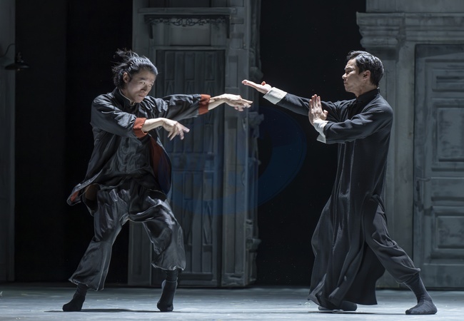 Sadlers Wells, London, UK. 29th August, 2024. Wing Chun - A fusion of contemporary dance, drama and martial arts tells the true story of Grandmaster Yip Man, trainer of Bruce Lee, choreographed by Han Zhen and Zhou Liya & written by Feng Shuangbai. Running from 30 Aug-7 Sept the spectacle tells the story of the 300-year-old martial art Wing Chun and the man who is credited with bringing it to the world, Grandmaster Yip Man, the man who trained Bruce Lee and founded The Ving Tsun Athletic Association. Image: Fight scene, Praying Mantis Master - He Junbo, Tai Chi Master - Zhang Zhenguo, Credit:MALCOLM PARK / Avalon