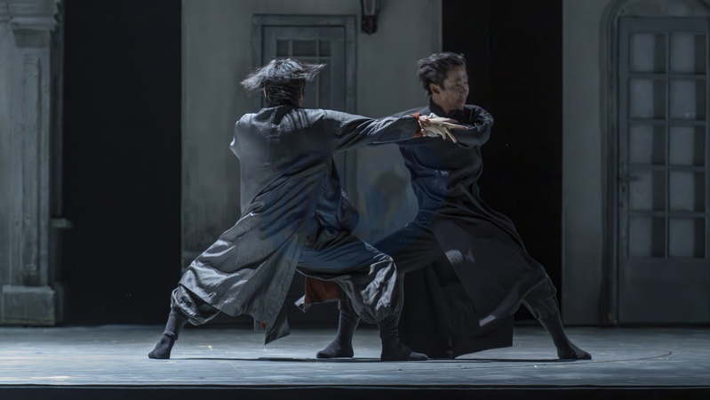 Sadlers Wells, London, UK. 29th August, 2024. Wing Chun - A fusion of contemporary dance, drama and martial arts tells the true story of Grandmaster Yip Man, trainer of Bruce Lee, choreographed by Han Zhen and Zhou Liya & written by Feng Shuangbai. Running from 30 Aug-7 Sept the spectacle tells the story of the 300-year-old martial art Wing Chun and the man who is credited with bringing it to the world, Grandmaster Yip Man, the man who trained Bruce Lee and founded The Ving Tsun Athletic Association. Image: Fight scene, Praying Mantis Master - He Junbo, Tai Chi Master - Zhang Zhenguo, Credit:MALCOLM PARK / Avalon
