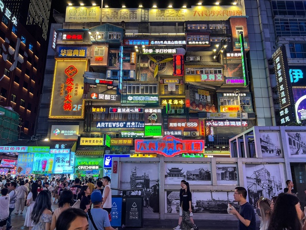 A view of the neon signs of businesses, mostly of snacks, on a building in a pedestrian street in Changsha in south China's Hunan province Sunday, Aug. 25, 2024., Credit:FEATURECHINA / Avalon