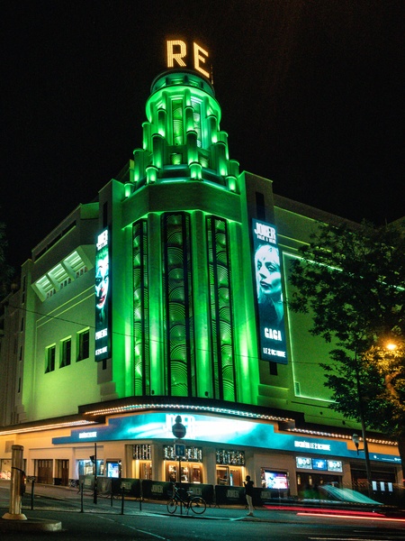 Illustrations de la façade du Grand Rex à Paris habillée aux couleurs du film Joker : Folie à deux
